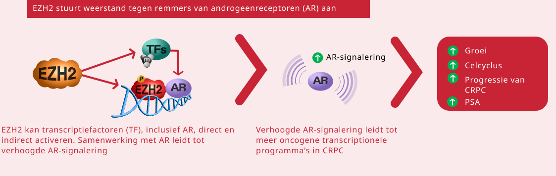 EZH2 stuurt prostaatkankergroei en behandelingsresistentie op een aantal manieren aan, waaronder: