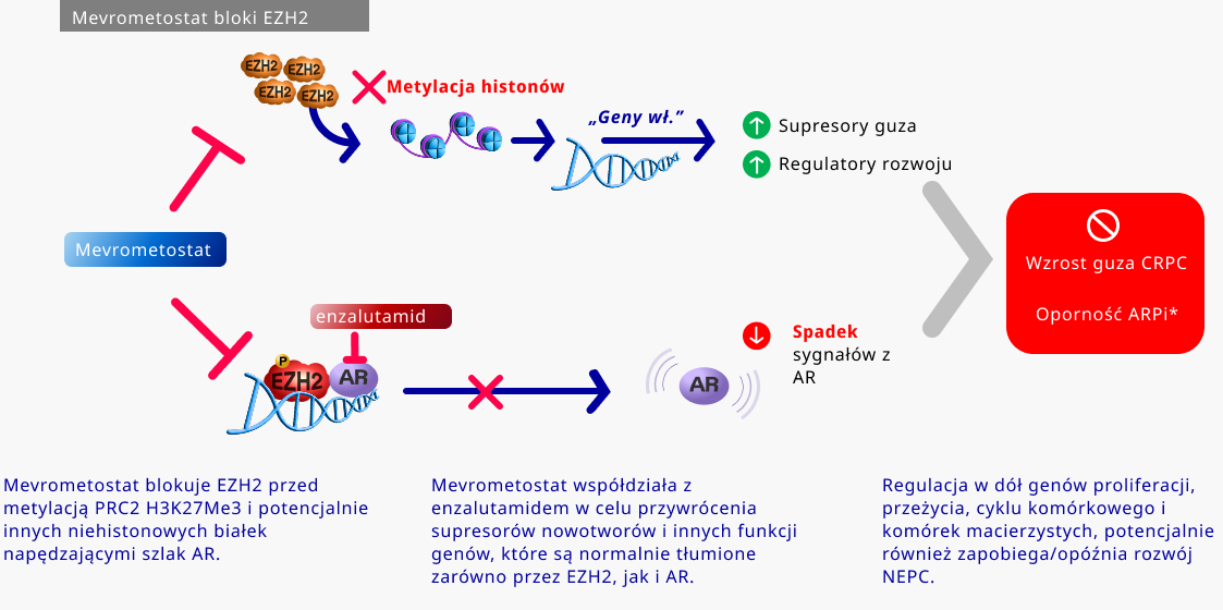 Skojarzenie mevrometostatu z enzalutamidem może przywrócić działanie genu, w przypadku którego doszło do represji spowodowanej zarówno przez EZH2, jak i receptory androgenowe, co powoduje zmniejszenie proliferacji, przeżycia i progresji cyklu komórkowego.