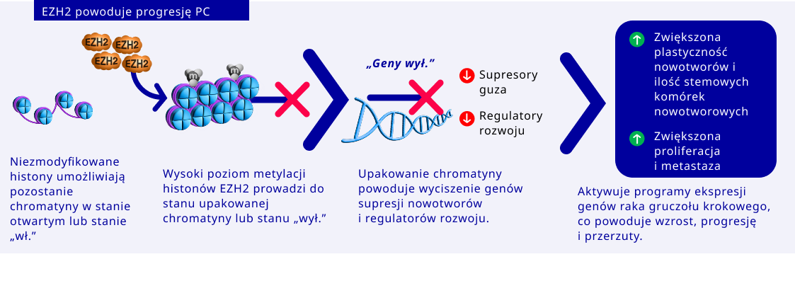 EZH2 napędza wzrost raka gruczołu krokowego i oporność na leczenie na wiele sposobów, w tym poprzez: